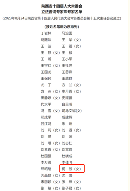 9月1日,陕西省人大公布了陕西省十四届人大常委会立法咨询专家库专家名单,我校人文社会科学学院副院长、法学系教授何芳成功入选。