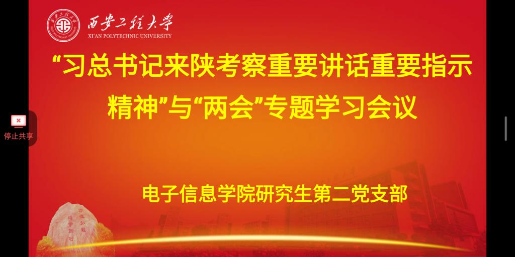 2020年5月21日,西安工程大学电子信息学院研究生第二党支部在线上召开了以“习近平总书记来陕考察重要讲话重要指示精神”与“两会”专题学习会议”为主题的党员大会。支部书记刘许与32名党员及积极分子参与了本次会议。