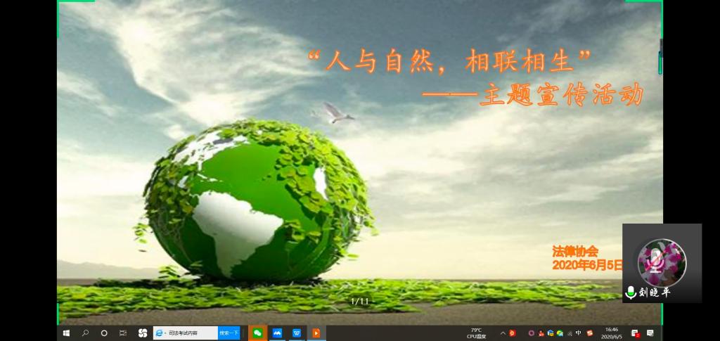 6月5日是第49个“世界环境日”,为增强同学们的环保意识,营造人人保护环境的良好氛围。人文学院开展了以“人与自然,相联相生”为主题的线上环境保护主题教育活动。本次活动由人文学院团总支主办、大学生法律协会承办。人文学院法学系专业教师刘晓平、团总支书记刘杨扬出席此次活动,大学生法律协会全体成员参加了此次活动。