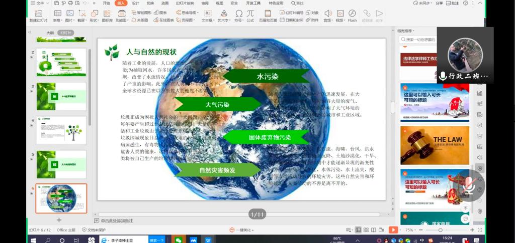 首先,大学生法律协会李雪川向大家介绍了“6·5世界环境日”的相关知识并播放视频,让同学们知悉“世界环境日”,认识到环境保护的重要性与紧迫性。随后,部分社团成员通过原创征文、海报、PPT等形式向大家分享了自己参与环境保护的经历和感悟,各位同学各抒己见、充分交流,呼吁大家保护环境、爱护自然。