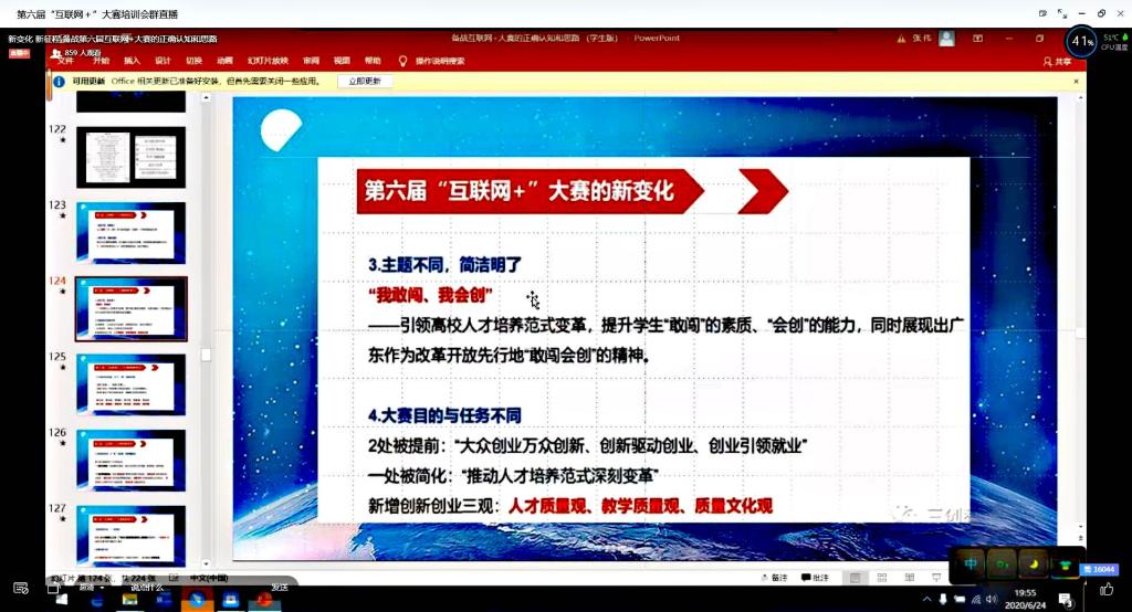 为进一步做好我校第六届中国国际“互联网+”大学生创新创业大赛的备赛工作,切实提升我校参赛项目的质量和水平,提升指导教师和学生团队创新创业能力,使参训人员了解更多创新创业竞赛常识,进一步增强创新创业教育的科学性和实效性。2020年6月24日,我校举办第六届中国国际“互联网+”大学生创新创业大赛线上培训,会议邀请教育部首批创新创业指导师张伟进行线上培训指导。本次会议由教务处主办,纺织科学与工程学院三全育人导师团承办。会议由纺织科学与工程学院党委副书记郭西平主持,各学院1000余名学生参加培训会。