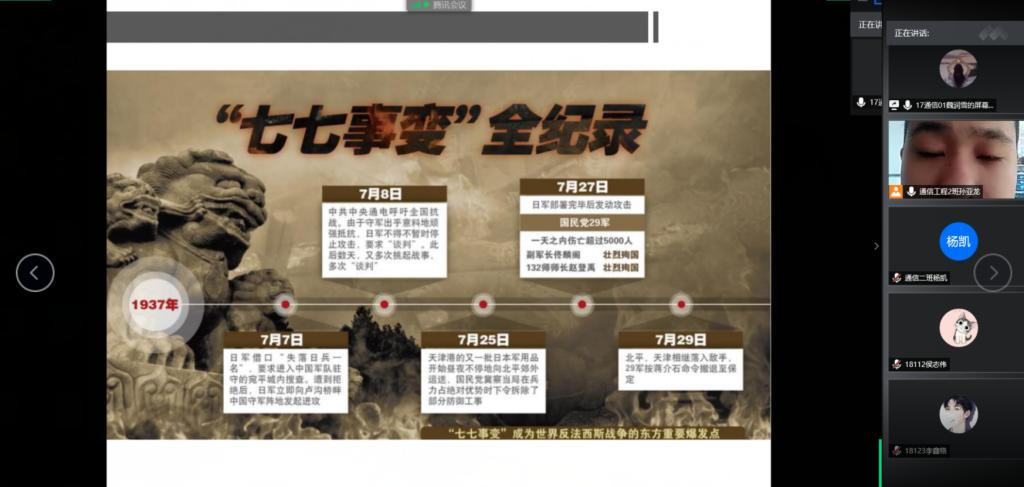 2020年7月7日是七七事变爆发83周年,为进一步弘扬爱国主义精神,培育和践行社会主义核心价值观,电子信息学院学生第二党支部网络召开“七七回眸:血染卢沟浸月啼”纪念“七七事变”83周年主题党日活动,回顾历史,缅怀先烈,继承遗志,教育和引导支部党员和积极分子爱党爱国,为实现中华民族的伟大复兴而努力奋斗。