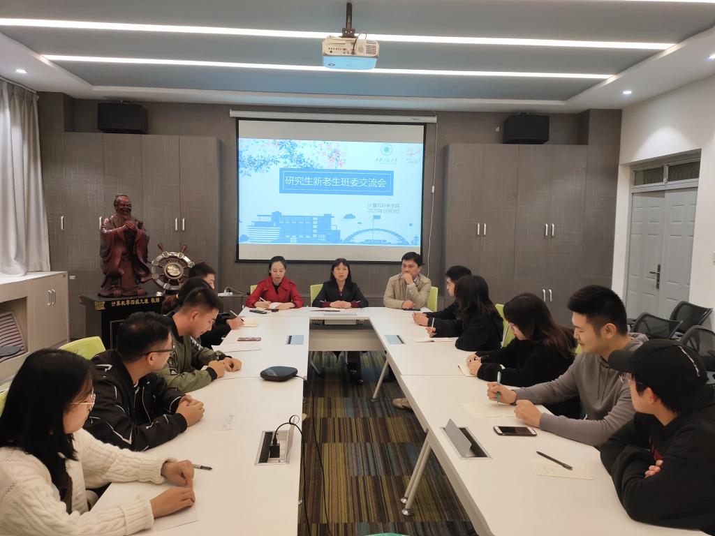 10月9日下午,计算机科学学院在426会议室举行研究生新老班委经验交流会,院党委书记王雅慧、副院长陈金广、研究生秘书郝筱松、研究生辅导员程帅及各年级班委参加了本次会议。会议由研究生辅导员程帅主持。